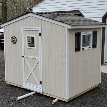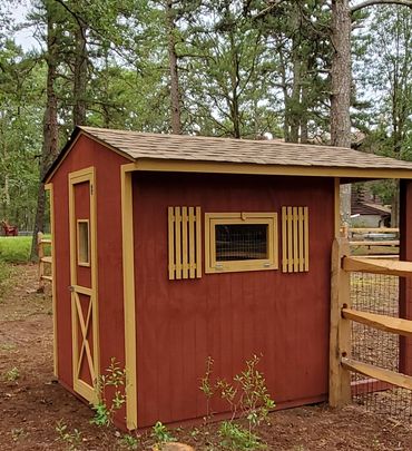 Any wood that touches the ground is pressure treated. We use T-111 sheathing; Timberline Roofing shingles with tar paper and starter strips; welded wire in livestock shed windows; barn style doors; all painted in colors of your choice. (We even torched the outer sheathing of a shed for a burned look per customer's request.) We do not use any plastic in or on our products. Unlike other builders, we do not use chip board or subpar materials.